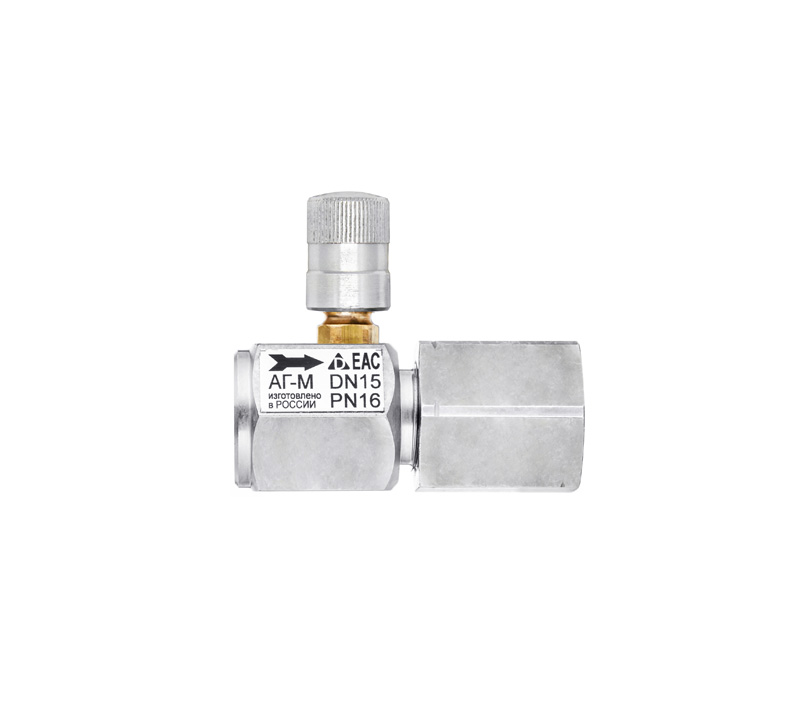 Кнопочный запорный клапан АГ-М (аналог клапана VE2-2) предназначен для перекрытия потока рабочей среды к манометру на низкие давления КМ (напоромеру) или ТМ, а также для снижения постоянной нагрузки давления среды, которая негативно сказывается на чувствительном элементе прибора – мембране или трубке Бурдона. Длительное нахождение мембраны под давлением ухудшает метрологические свойства прибора (снижается точность показаний). Установленный перед прибором клапан, позволяет автоматически перекрывать и разгружать систему с давлением до 1,6 МПа (16 кгс/см2). При необходимости подключения давления к измерительному прибору необходимо нажать кнопку до упора и провернуть на произвольный угол. Повернув кнопку, под действием пружины происходит возврат штока в исходное положение и перекрывание каналов, а излишки давления газа сбрасываются из полостей измерительных приборов во внешнюю среду. Герметизация штока осуществляется уплотнительными кольцами. Запорный клапан частично изготовлен из латуни, поэтому его можно использовать только для газов и неагрессивных жидкостей.