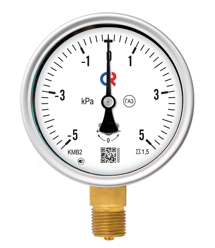 Тип КМ (КМВ). Манометр для измерения низких давлений газов (напоромер) применяется для измерения давления сухих, газообразных сред, неагрессивных к медным сплавам. Принцип действия манометров КМ основан на зависимости деформации чувствительного элемента от измеряемого значения кПа. В качестве чувствительного элемента используется мембранная коробка. Под воздействием измеряемого давления центр мембранной коробки перемещается и с помощью специального передаточного механизма вращает стрелку прибора.