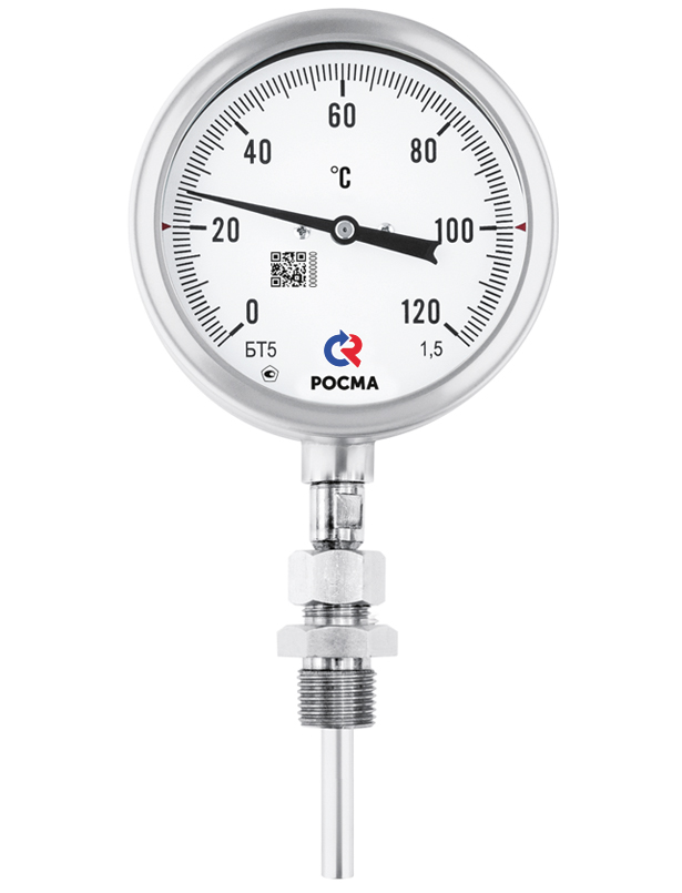 ТЕРМОМЕТР биметаллический коррозионностойкий 100мм, Тип – БТ-52.220, радиальное присоединение. 0-60С. Резьба G1/2. Длина штока 150мм. Класс точности 1,5. Свободная внутренняя резьба.