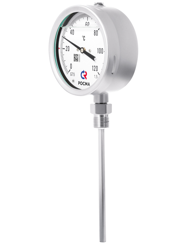 Тип БТ, серия 220. Коррозионностойкий термометр с радиальным присоединением и резьбой на штоке. Предназначен для измерения температуры агрессивных жидкостей и газов. Принцип действия термометров БТ основан на зависимости деформации чувствительного элемента от измеряемой температуры. В качестве чувствительного элемента используется биметаллическая пружина. Биметаллическая пружина изготавливается из двух прочно соединенных металлических пластин, имеющих различные температурные коэффициенты линейного расширения. При изменении температуры пружина изгибается и вращает стрелку термометра. Один конец пружины закреплен внутри штока, а к другому присоединяется ось стрелки. Корпус и шток коррозионностойкого термометра изготовлены из нержавеющей стали. Возможна комплектация термометра гильзой из нержавеющей стали с давлением до 25 МПа или до 60 МПа. Прибор поставляется «сухой» (готовый к гидрозаполнению) или заполненный силиконом по требованию заказчика. Гидрозаполнение возможно только для БТ с диапазоном показаний температур до 250°С.