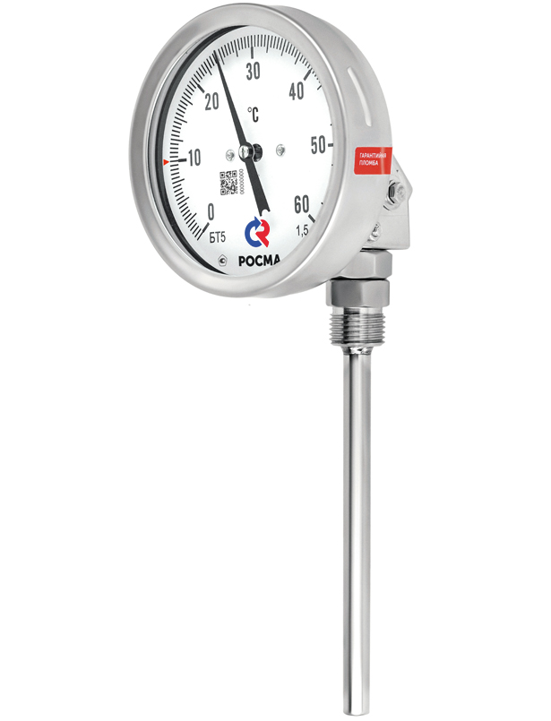 Тип БТ, серия 220. Коррозионностойкий термометр с универсальным присоединением (поворотно-откидным корпусом) с резьбой на штоке. Предназначен для измерения температуры агрессивных жидкостей и газов. Принцип действия термометров БТ основан на зависимости деформации чувствительного элемента от измеряемой температуры. В качестве чувствительного элемента используется биметаллическая пружина. Биметаллическая пружина изготавливается из двух прочно соединенных металлических пластин, имеющих различные температурные коэффициенты линейного расширения. При изменении температуры пружина изгибается и вращает стрелку термометра. Один конец пружины закреплен внутри штока, а к другому присоединяется ось стрелки. Корпус и шток коррозионностойкого термометра изготовлены из нержавеющей стали. Возможна комплектация термометра гильзой из нержавеющей стали с давлением до 25 МПа или до 60 МПа. Прибор поставляется «сухой» (готовый к гидрозаполнению) или заполненный силиконом по требованию заказчика. Гидрозаполнение возможно только для БТ с диапазоном показаний температур до 250°С.